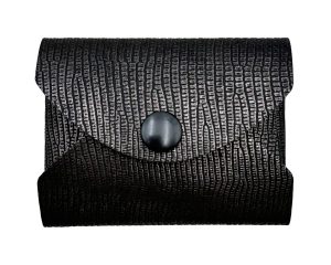 - Schwarzes Lanyard: Mit silbernem Federring und Patch sowie Portemonnaie in Leguan-Imitat mit schwarzem Druckknopf und schwarzer Prägung.