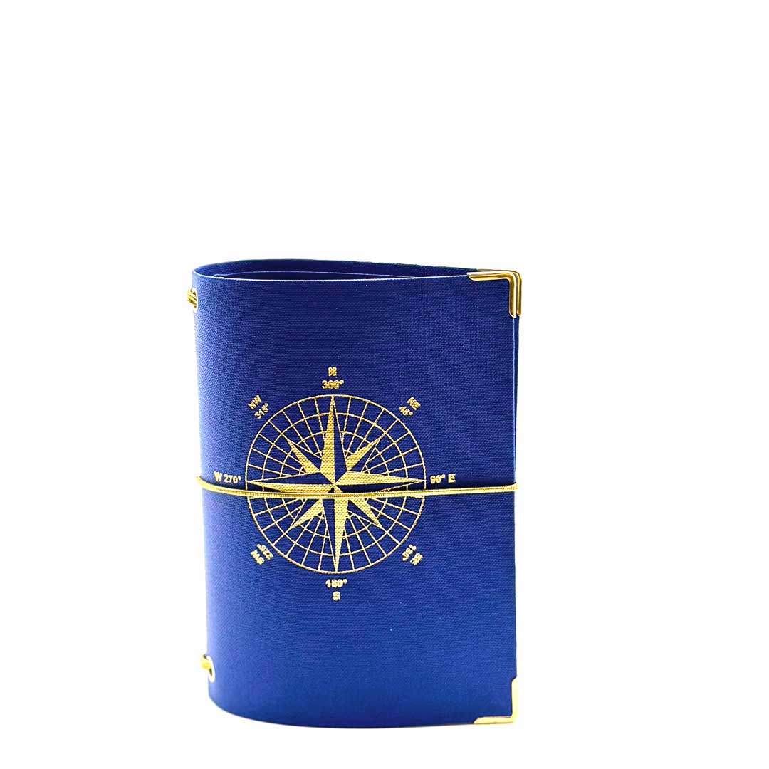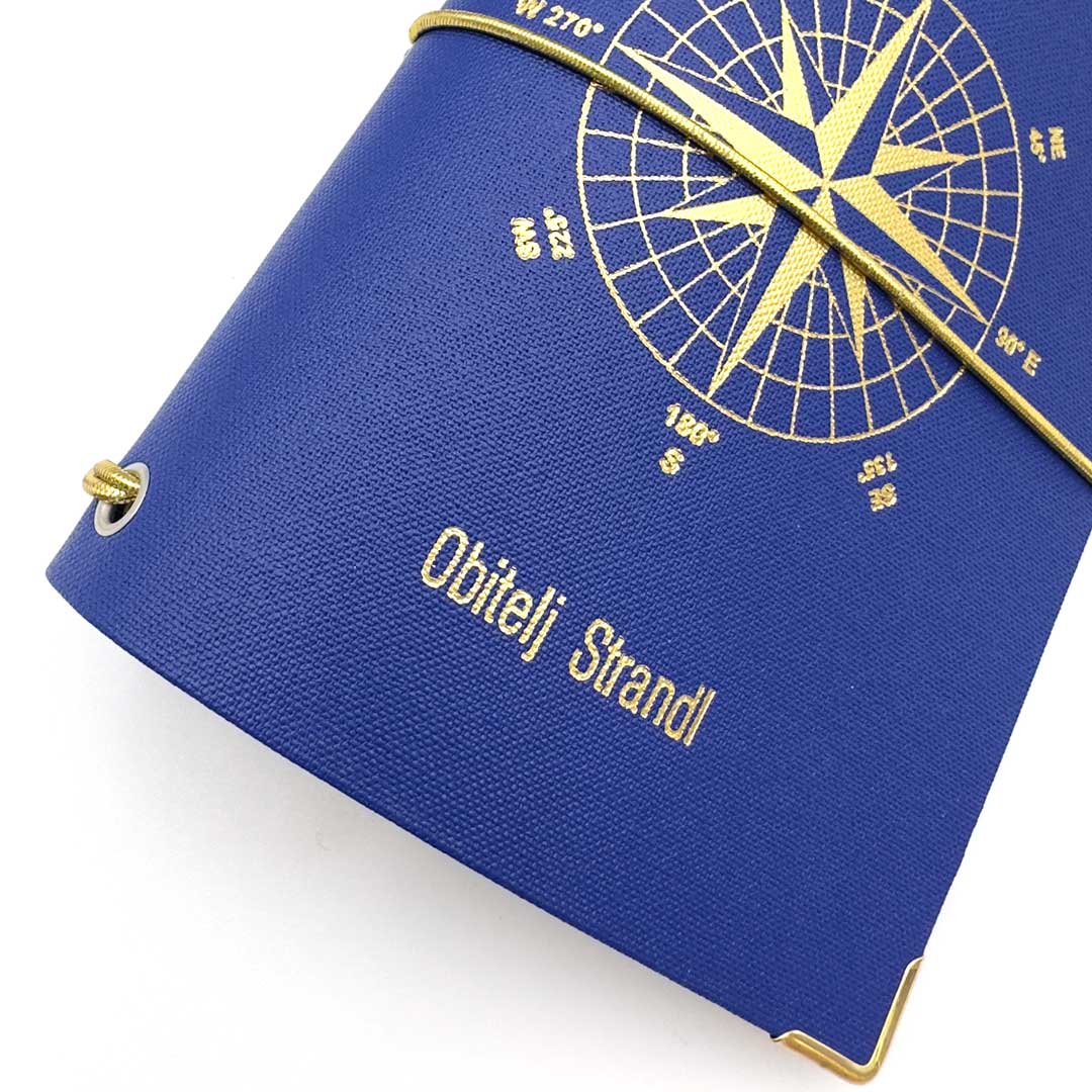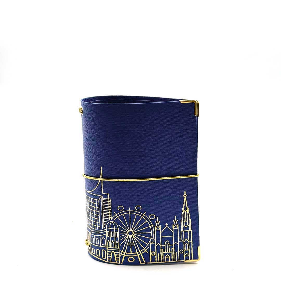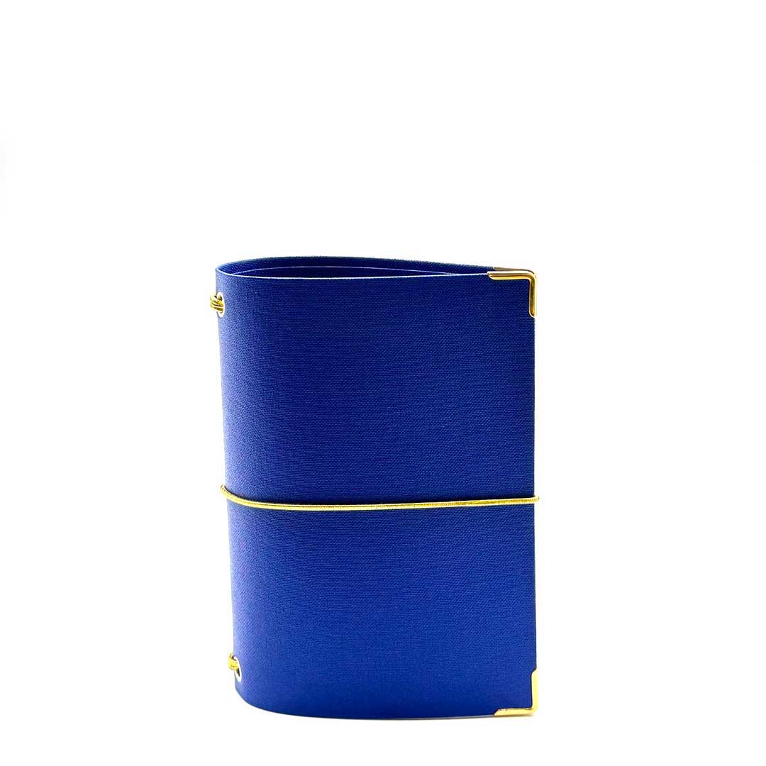 • beschichtetes, abwischbares und kratzfestes Leinen, blau mit goldener Prägung.