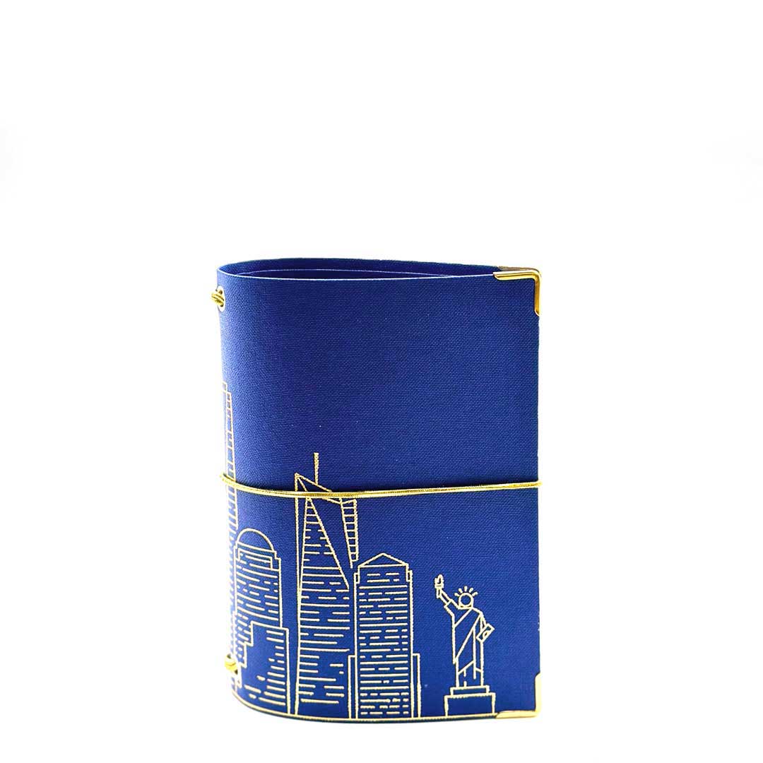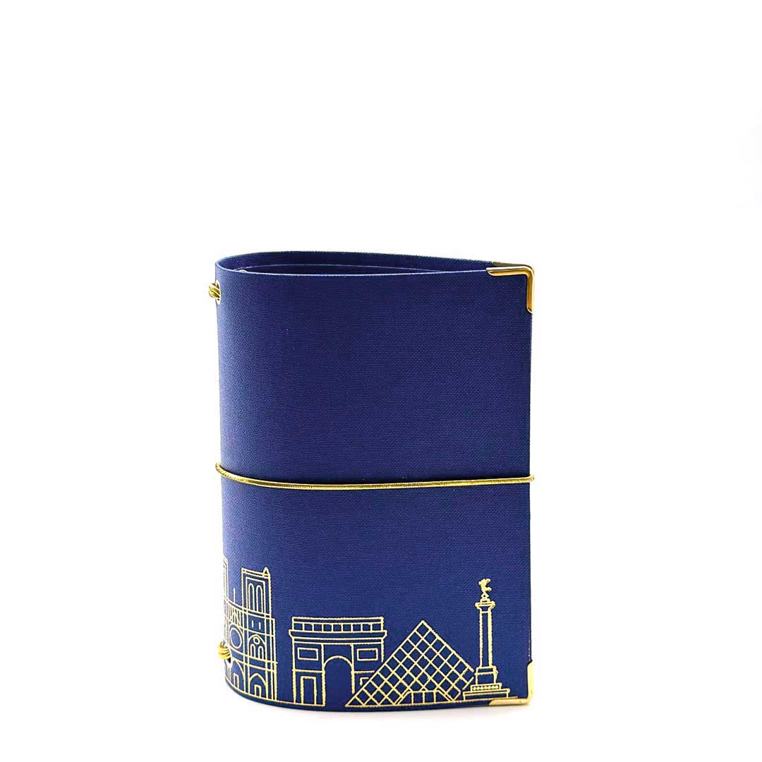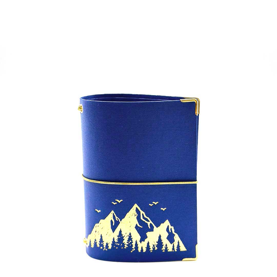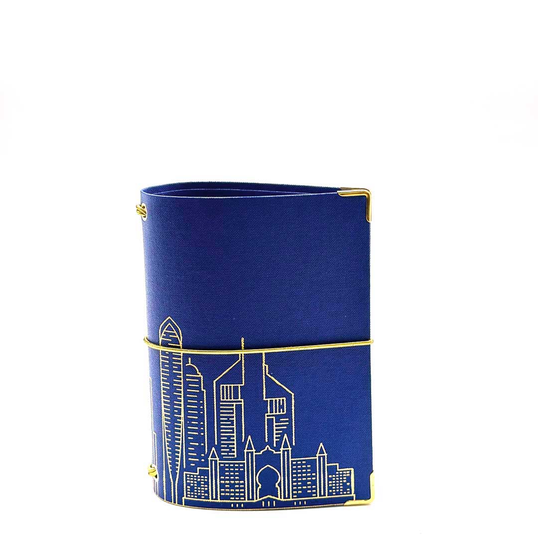 • beschichtetes, abwischbares und kratzfestes Leinen, blau mit goldener Prägung.